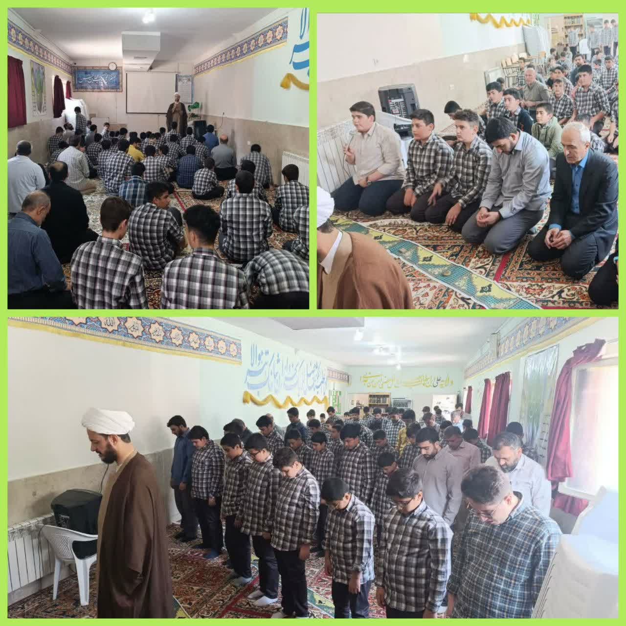 هر روز نماز جماعت ظهر و عصر به حضور پورشور دبیران و دانش آموزان در حسینیه شهید عراقی دبیرستان دوره اول شهدای موتلفه اسلامی به امام حجت الاسلام محتشمی مسئول محترم پایه هفتم برگزار می گردد.
