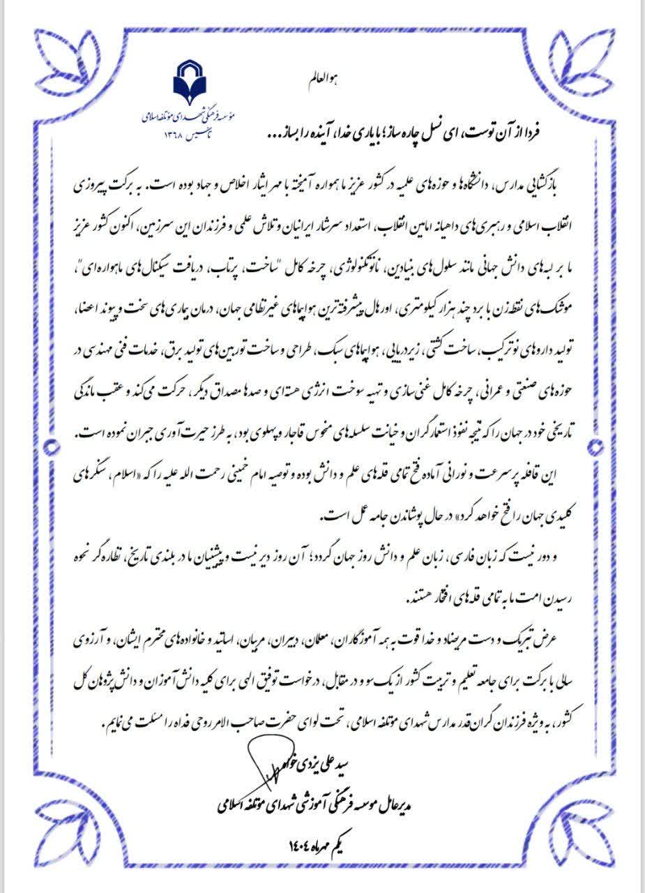 پیام مدیرعامل محترم موسسه فرهنگی شهدای موتلفه اسلامی خطاب به دانش آموزان به مناسبت اول مهر و بازگشایی مدارس